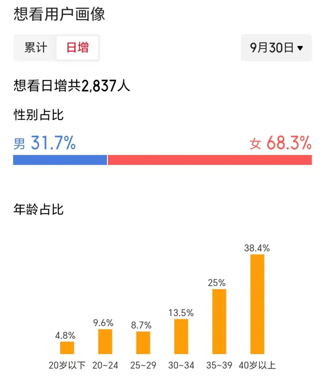 猫眼专业版显示,《志愿军3》的想看用户画像中,其40岁以上年龄层占比最高。同样受这一年龄段观众喜欢的还有《三国的星空第一部》,其中女性占比逼近70%。