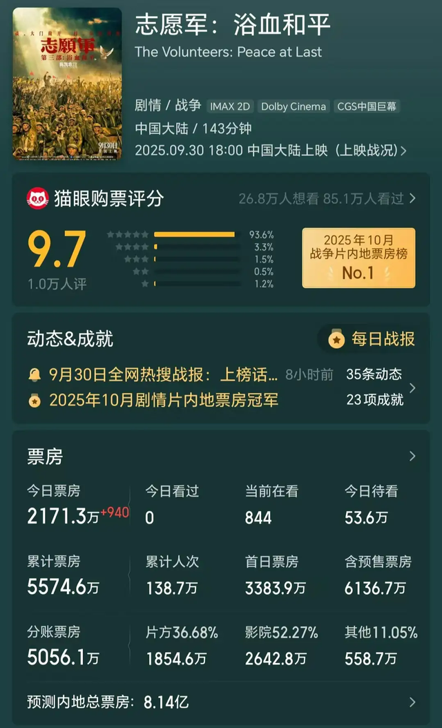 “观众对主旋律片有需求,加上前两部也积累下来了一部分粉丝,《志愿军3》自带情怀buff,即便整体票房大环境一般,它也有实力成为前两天票房榜单上的领头羊。”陶经理表示。